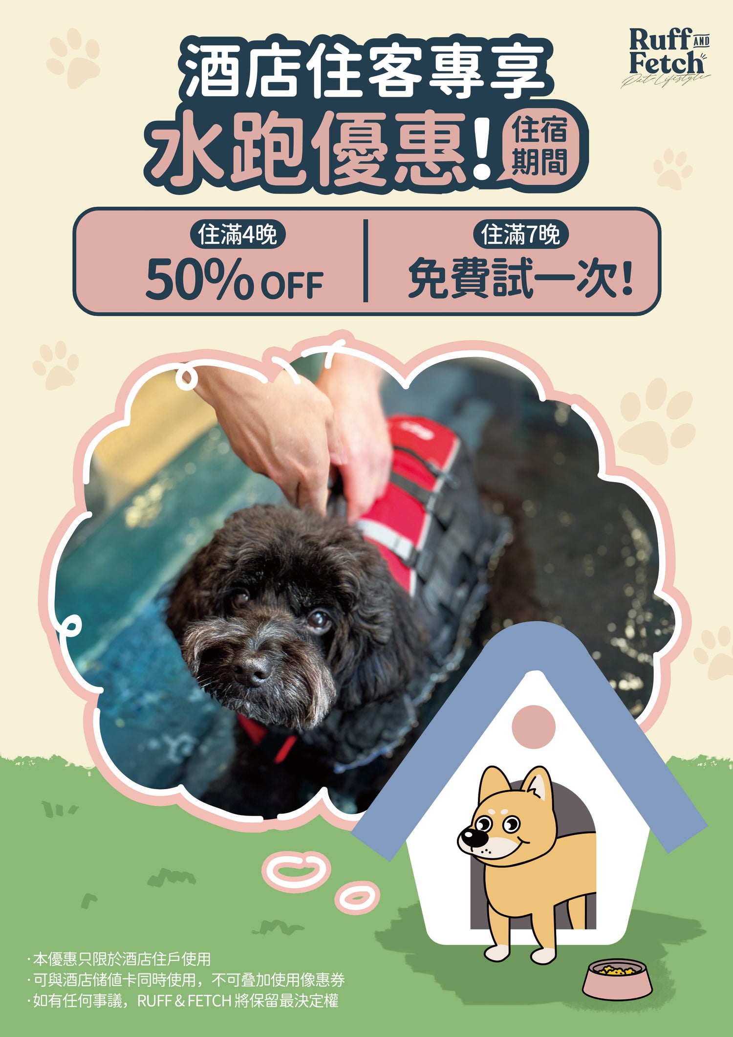 經 Ruff & Fetch 預訂酒店期間,狗狗可享 美容及零售 9 折優惠!